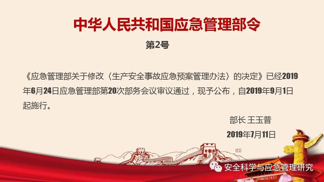 中華人民共和國應(yīng)急管理部令第2號(hào)發(fā)布,內(nèi)容是關(guān)于修改原安全監(jiān)管總局88號(hào)令《生產(chǎn)安全事故應(yīng)急預(yù)案管理辦法》,一共涉及19條修改,同時(shí)將修改后的文本正式發(fā)布!