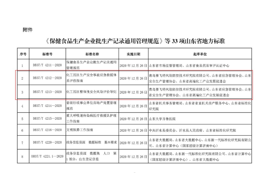近日,山東省市場監(jiān)督管理局批準發(fā)布了33項山東省地方標準。其中的《化工園區(qū)生產(chǎn)安全事故應急救援體系評估指南》(DB37/T 4212-2020)、《化工園區(qū)整體性安全風險評價導則》(DB37/T 4213-2020)由青島賽飛特風險防控技術研究院有限公司、山東省應急管理協(xié)會、山東省安全生產(chǎn)管理協(xié)會、山東省高端化工產(chǎn)業(yè)發(fā)展促進會聯(lián)合起草,現(xiàn)分享給各位: