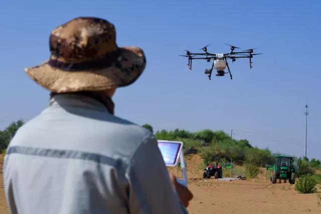 ↑這是內(nèi)蒙古鄂爾多斯市杭錦旗庫布其沙漠中的生態(tài)修復景觀(2018年7月11日無人機拍攝)