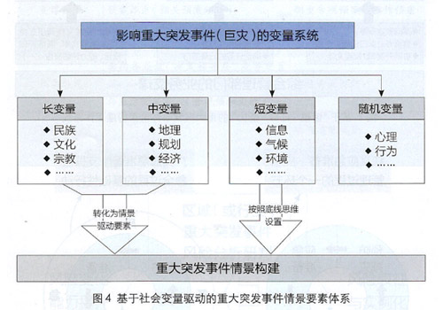 重大突發(fā)事件本身是一個復雜系統(tǒng)。當嘗試通過“情景構建”來表征重大突發(fā)事件的規(guī)律特點時,按照社會物理學理論,需要對一系列社會變量進行描述,決定重大突發(fā)事件情景的變量包含:長變量(與民族、文化、宗教相關的變量)、中變量(與地理、規(guī)劃、經濟、社會相關的變量)、短變量(與信息、氣候、環(huán)境、交通等相關的變量)、隨機變量(與心理、行為以及未知因素相關的變量)(見圖4)。為確保重大突發(fā)事件情景能夠準確地代表不斷演化的國家風險(或者地區(qū)風險),情景構建過程中,需將上面所述的長變量與中變量設置為情景恒定要素,當這兩類變量發(fā)生變動時,需要及時修訂情景;此外,關于短變量,應該基于“底線思維”,設置可能導致事件往最壞方向發(fā)展的變量,這樣可以有效保證與情景所匹配的目標能力具備“冗余”。而隨機變量,對于情景構建來說不具備較大價值,不應該在情景中描述。