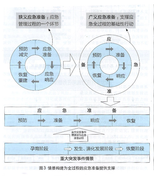 (一)全過程、多角度的情景分析。經典的應急管理理論,將應急管理過程劃分為四個階段:預防、準備、響應和恢復。近十年應急管理學界逐步認識到應急準備的重要性,將其從單純一個過程環(huán)節(jié)提升為“支撐應急全過程”的基礎性行動,進而有了“廣義應急準備”和“狹義應急準備”兩個不同的概念,如圖3所示。