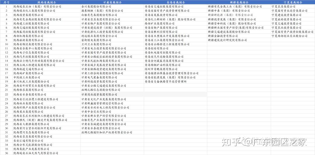 西北5省分別為陜西、甘肅、寧夏、新疆和青海。西北5省共擁有103家省級(jí)國企,其中陜西數(shù)量最多36家、甘肅31家、青海19家、新疆9家、寧夏8家。