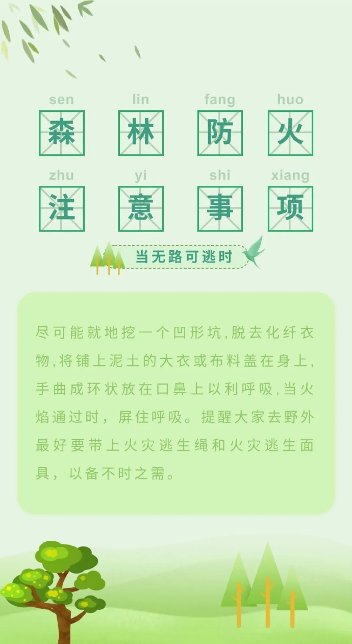 步入三月份以來,全國各地氣溫回升,物種植被干燥,火險等級逐步升高,給森林防火滅火帶來嚴(yán)峻考驗(yàn)。那么,普通群眾遇到森林火災(zāi)時,該如何最大限度的減小森林火災(zāi)對自身的危害呢?這些森林火災(zāi)基本逃生方法,一定要記住哦?。ǜ拭C省森林消防總隊平?jīng)鲋ш狇v黃陵分隊:倪騰飛)