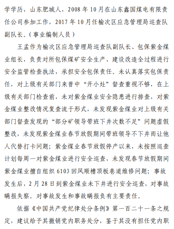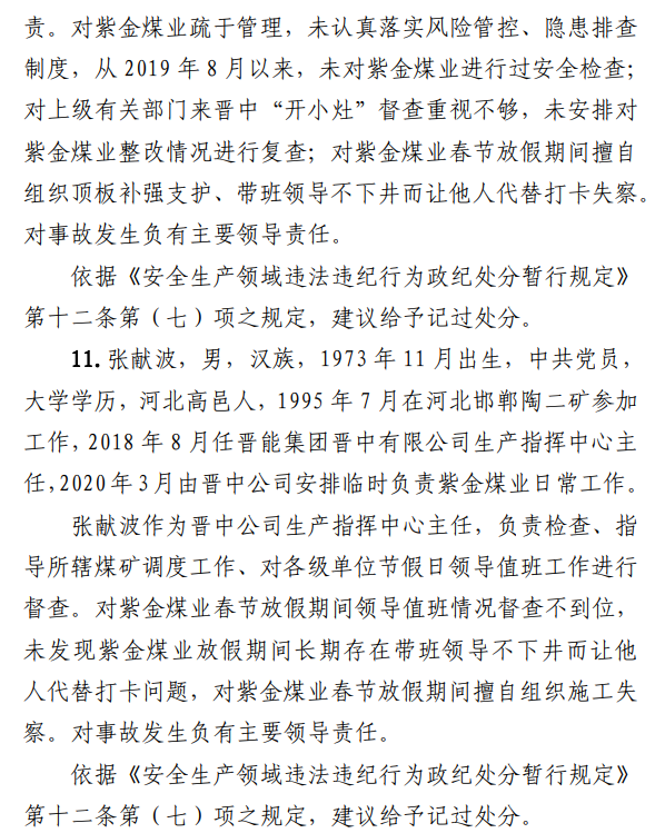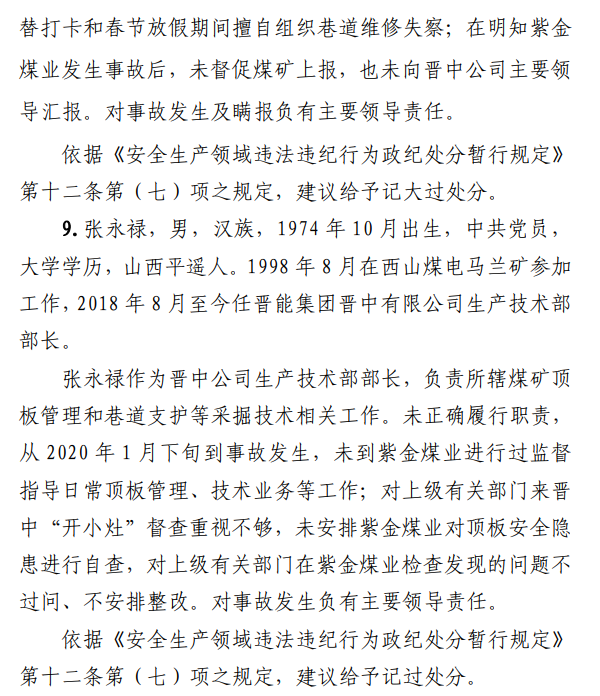 2月23日20時44分,探水隊副隊長王志平通過6103回風順槽距開口950m處的電話,向礦調(diào)度室匯報了事故情況。20時46分,調(diào)度值班人員張宏強向礦長郭英杰匯報事故情況。郭英杰立即啟動應急救援預案,組織煤礦相關人員開展搶險救援工作。救援人員使用單體液壓支柱、半圓木、鉸接梁對事故地點外圍巷道進行臨時支護,然后由外到里清渣、支護,實施救援。被冒落頂板埋壓的劉永生、馬練水和王秀國于2月24日14時30分、2月25日6時30分、2月25日14時分別被救出升井。經(jīng)醫(yī)生在井口確認,3人已無生命體征,之后被送往榆次區(qū)殯儀館,搶險救援工作結束。2月24日,礦長郭英杰安排信息中心主任梁煥修改人員定位系統(tǒng),關閉了工業(yè)視頻,刪除調(diào)度錄音通訊、虹膜數(shù)據(jù)。2月25日17時許,紫金煤業(yè)紀檢書記、黨總支副書記高建忠(臨時主持紫金煤業(yè)董事會及黨務日常事務)和礦長郭英杰組織召開煤礦管理層會議。會上郭英杰、高建忠、紫金煤業(yè)安全生產(chǎn)技術總監(jiān)南海為了瞞報事故,對偽造出入井數(shù)據(jù)、修改人員定位數(shù)據(jù)、銷毀調(diào)度電話錄音、刪除視頻監(jiān)控資料、清理井下事故現(xiàn)場等事項進行了安排。2月24日至25日,高建忠安排生產(chǎn)副礦長杜永忠、安全副礦長楊雙喜等人與遇難者家屬協(xié)商辦理賠償事宜,并安排遇難者家屬配合礦方瞞報事故。3月5日,在榆次區(qū)人民政府組織的核查過程中,郭英杰、高建忠均否認事故發(fā)生,郭英杰、高建忠、南海繼續(xù)安排煤礦有關工作人員瞞報事故。3月8日上午9時許,在榆次區(qū)人民政府已查實事故、正在擬文上報的期間,紫金煤業(yè)向山西煤銷晉中公司、榆次區(qū)應急管理局和晉中煤監(jiān)分局電話匯報事故,稱三名巡檢人員走到事故地點時,頂板突然冒落導致事故發(fā)生,謊報了事故的經(jīng)過和原因。2月23日22時左右,武全珍在井下安排王家偉完善措施內(nèi)容。王家偉出井后在措施中增加了:“頂板較完整區(qū)域補強支護期間采用單體支柱+鉸接頂梁做臨時支護,頂板不平整處使用方木墊平、木楔背緊背實”,和“臨時支護安全技術措施”相關內(nèi)容。2月24日上午,武全珍安排王家偉在該措施中增加了“絞車運輸安全技術措施”和“移動乳化液泵使用安全技術措施”等內(nèi)容。3月8日,生產(chǎn)礦長杜永忠安排探水隊隊長王聚寶在班前會記錄中加上“先抽400米水”。當天晚上,安全礦長楊雙喜在在班前會記錄中加上“不準進尺,打好臨時支護再作業(yè)”等內(nèi)容。現(xiàn)場人員在無臨時支護的情況下違章進行補強支護作業(yè),施工過程中頂板失穩(wěn)冒落,導致事故發(fā)生。1.紫金煤業(yè)對處于極限平衡狀態(tài)的6103回風順槽頂板存在的安全隱患辨識不清、安全風險管控不力6103回風順槽巷道埋深大、圍巖較軟,且為迎采對掘巷道,受臨近的6101工作面開采動壓影響大,多根錨桿錨索斷裂失效,巷道變形,底板鼓起,事故地點附近巷道頂板已處于高應力的極限平衡狀態(tài)。事故發(fā)生前,事故地點附近巷道頂板已先后發(fā)生兩次冒落。紫金煤業(yè)對6103回風順槽頂板存在的安全隱患辨識不清、重視不夠,未切實進行礦壓日常監(jiān)測分析,未對斷裂失效錨桿及時補強支護,施工時未采取臨時支護,安全風險管控不力。2.紫金煤業(yè)技術管理工作有漏洞,《6103回風順槽補強支護施工安全技術措施》對現(xiàn)場作業(yè)指導性差紫金煤業(yè)編制的《6103回風順槽補強支護施工安全技術措施》對巷道補強支護作業(yè)的臨時支護形式、技術參數(shù)和要求不具體,對現(xiàn)場作業(yè)指導性差。生產(chǎn)技術科科長王家偉編制措施前未到6103回風順槽實地查看頂板情況,生產(chǎn)礦長杜永忠、安全礦長楊雙喜、總工程師武全珍及相關部門負責人會審措施時審查把關不嚴,措施僅由探水隊隊長在班前會進行宣讀,學習貫徹不到位。3.6103回風順槽補強支護作業(yè)勞動組織混亂,現(xiàn)場安全監(jiān)管缺位事故當班,在探水隊隊長提出本隊人員不熟悉支護作業(yè)的情況下,礦領導違章指揮,仍然抽調(diào)安監(jiān)科和探水隊人員進行支護作業(yè)。作業(yè)人員安全風險辨識能力不足,安全意識淡薄。事故當班無帶班礦領導和跟班隊長,未設專職安監(jiān)員,現(xiàn)場安全監(jiān)管缺位。礦長郭英杰安排春節(jié)放假期間帶班礦領導可以不下井,將各自的人員定位卡放在調(diào)度室,調(diào)度員按帶班計劃表安排安全員將帶班礦領導的人員定位卡帶入井下。自春節(jié)放假至事故發(fā)生時,紫金煤業(yè)礦領導均未執(zhí)行帶班下井制度。5.紫金煤業(yè)在春節(jié)停產(chǎn)放假、未復產(chǎn)期間,未經(jīng)批準擅自組織6103回風順槽頂板補強支護作業(yè)2月23日下午,紫金煤業(yè)將《關于6101設備回撤密閉等井下工程施工請示》(包括6103回風順槽補強支護作業(yè)的內(nèi)容)報山西煤銷晉中公司和榆次區(qū)應急管理局。2月24日,山西煤銷晉中公司同意該請示,并向榆次區(qū)應急管理局報送《山西煤炭運銷集團晉中有限公司關于山西煤炭運銷集團晉中紫金煤業(yè)有限公司6101設備回撤等井下工程施工的請示》(晉中煤銷字〔2020〕40號)。2月25日,榆次區(qū)應急管理局同意并作出批復。紫金煤業(y