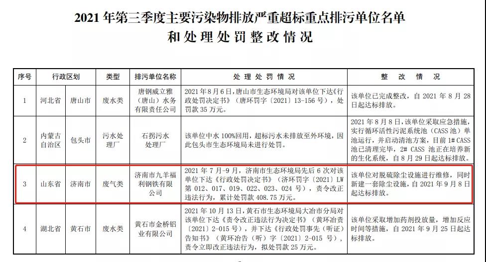 近日,生態(tài)環(huán)境部公布2021年第三季度主要污染物排放嚴(yán)重超標(biāo)重點(diǎn)排污單位名單和處理處罰整改情況。其中,濟(jì)南市九羊福利鋼鐵有限公司因廢氣類污染等環(huán)境違法行為,累計(jì)處罰款408.75萬元。