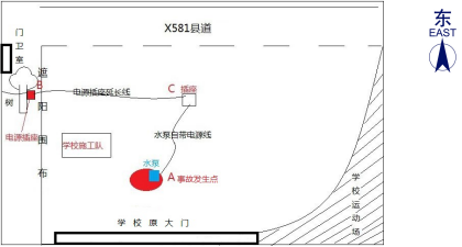 約9時,馮建威先到達(dá)現(xiàn)場查看情況,協(xié)調(diào)借用抽水泵和處理其他維修點工作。隨后,薛柏林、趙文輝駕駛工程車到達(dá)耕管村附近,將一些工具和材料送給附屬施工隊【1】后,約9時20分到達(dá)該爆水管處。兩人經(jīng)商量決定先抽走水坑里的水再檢查和維修水管。薛柏林駕駛工程車向附近(約500米外)作業(yè)的附屬施工隊借回一臺潛水泵(規(guī)格為3寸220V)和一根普通電源插座延長線,回來后將潛水泵放進(jìn)水坑中。趙文輝和薛柏林向?qū)W校維修項目工地(靠學(xué)校操場跑道側(cè))借用臨時用電,將連接潛水泵的電源插座延長線插在工地施工用的排插上,啟動后發(fā)現(xiàn)潛水泵不運行,兩人徒手搖晃潛水泵并調(diào)整插頭,發(fā)現(xiàn)潛水泵仍不運行。經(jīng)詢問現(xiàn)場施工人員及剛好經(jīng)過的學(xué)校保安林建軍,得知樹下還有一處借電點,保安林建軍未經(jīng)請示校領(lǐng)導(dǎo)同意擅自協(xié)助兩人將電源插座延長線直接插到樹上排插上,此時潛水泵還是不運作,趙文輝和薛柏林懷疑潛水泵可能有故障或者是有雜物堵塞。約9時45分,趙文輝走向C處查看插頭是否松動時,薛柏林則用雙手徒手檢查潛水泵故障,不慎發(fā)生觸電。此時,馮建威已回來在一旁與上橫中心小學(xué)的張志老師交談,突然聽到薛柏林發(fā)出“觸電”的叫聲,隨即跌倒在地,雙腳落入水坑中。趙文輝立馬拔掉潛水泵自帶電源線的插頭,薛柏林掙扎爬到水坑邊臉朝下趴在地上,臉色發(fā)白,處于昏迷狀態(tài)。