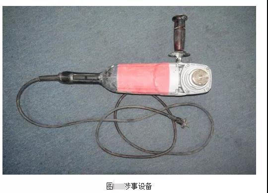 涉事設備產(chǎn)品名稱為角向磨光機,所有人:彭小共,型號:S1M-HL02B-180,電源電壓:220V-50Hz,額定空載轉速:8400r/min,功率:2600W,砂輪外徑:φ180mm,生產(chǎn)單位:蘇州聚匠人五金工具有限公司,銘牌處還有閱讀說明書提示標識和佩戴護目鏡提示標識,測得涉事設備的砂輪片安裝軸直徑為φ25.4mm。涉事設備的前端部位為金屬材質,其余部位均為塑料材質。
