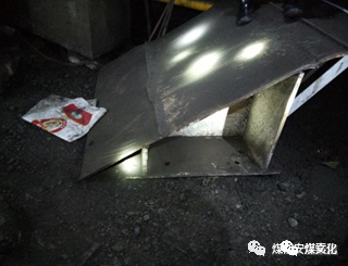 事故地點(diǎn)位于Z14-2W01綜采工作面回風(fēng)順槽,距工作面23.5m超前支架處。 事故發(fā)生地點(diǎn)的超前支架已卸載,頂梁距離頂板最小距離0.7m,最大距離1.6m,超前支架底座前2.5m處有從支架頂部滑落的三角形斜梁,長(zhǎng)1.82m,寬1.5m,高0.7m,重約900kg,三角形斜梁底座有焊印,支架頂梁上無螺栓孔,支架與三角形斜梁靠上幫處有一鐵質(zhì)工具箱(見圖2);Z14-2W01綜采工作面存在19.1㎡的空頂范圍。其余詳見《現(xiàn)場(chǎng)勘查報(bào)告》。