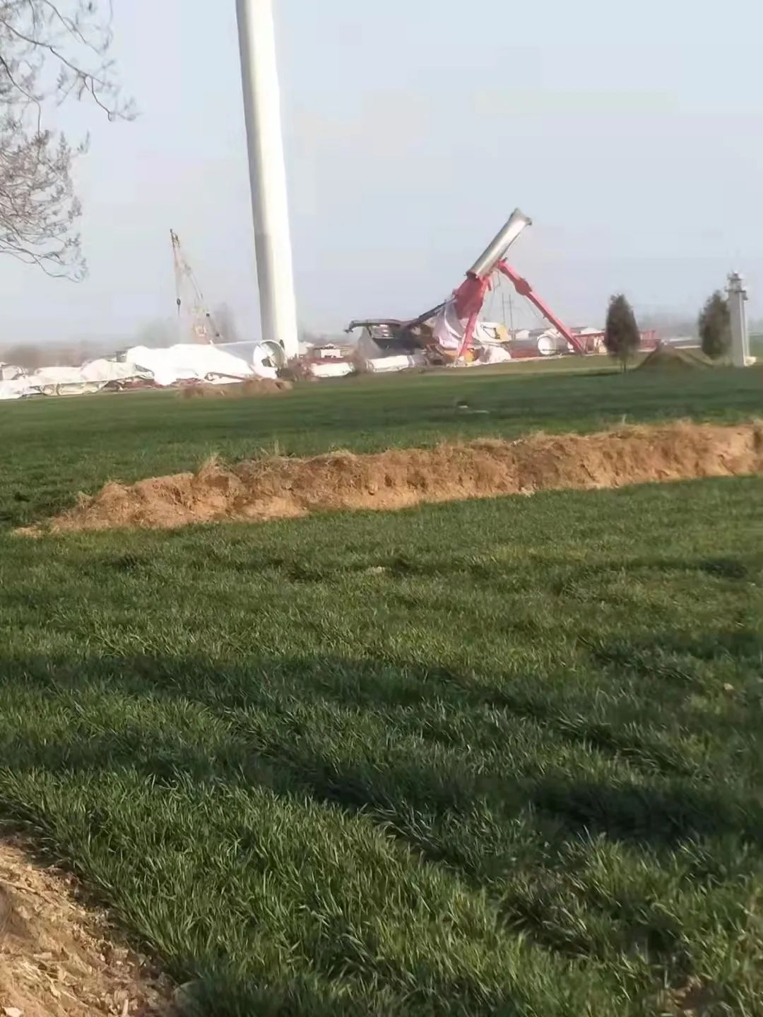 當(dāng)時吊裝的機組已墜落,二節(jié)臂已經(jīng)出現(xiàn)折損,超起吊臂再向前方到下,引發(fā)前端吊臂的90度折臂分離,整車也失去重心,向前方倒下...。眼睜睜看著800噸吊車倒下,我卻無能為力這是當(dāng)時現(xiàn)場人員的自述,還有下面拍下的現(xiàn)場照片。