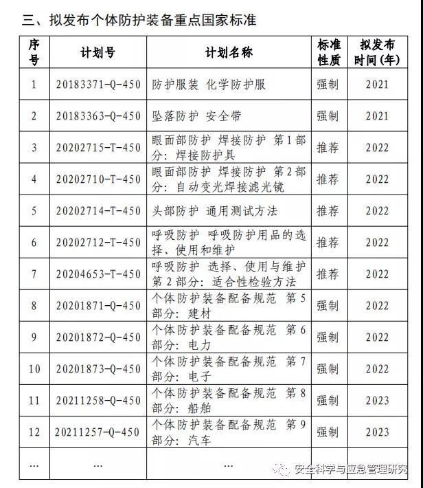 一、總體要求 深入學(xué)習(xí)貫徹習(xí)近平總書(shū)記“把人民群眾生命安全和身體健康放在第一位”的重要指示精神,落實(shí)《國(guó)家標(biāo)準(zhǔn)化發(fā)展綱要》,實(shí)施公共安全標(biāo)準(zhǔn)化筑底工程,堅(jiān)持人民至上、生命至上,聚焦重點(diǎn)行業(yè)、重點(diǎn)產(chǎn)品,加大標(biāo)準(zhǔn)研制工作進(jìn)度,充分發(fā)揮標(biāo)準(zhǔn)引領(lǐng)帶動(dòng)作用,推動(dòng)個(gè)體防護(hù)裝備質(zhì)量與安全水平持續(xù)提升,推動(dòng)生產(chǎn)經(jīng)營(yíng)單位嚴(yán)格按照國(guó)家標(biāo)準(zhǔn)要求配備個(gè)體防護(hù)裝備,為維護(hù)勞動(dòng)者安全健康權(quán)益提供更加有力支撐。 到2023年底,個(gè)體防護(hù)裝備標(biāo)準(zhǔn)體系進(jìn)一步完善,重點(diǎn)個(gè)體防護(hù)裝備產(chǎn)品標(biāo)準(zhǔn)水平持續(xù)提升,主要性能指標(biāo)與國(guó)際、國(guó)外發(fā)達(dá)國(guó)家保持基本一致,個(gè)體防護(hù)裝備國(guó)際標(biāo)準(zhǔn)取得重點(diǎn)突破。推出一批重點(diǎn)行業(yè)個(gè)體防護(hù)裝備配備標(biāo)準(zhǔn),配備標(biāo)準(zhǔn)對(duì)生產(chǎn)經(jīng)營(yíng)單位個(gè)體防護(hù)裝備的規(guī)范作用初步顯現(xiàn)。重點(diǎn)個(gè)體防護(hù)裝備質(zhì)量監(jiān)督抽查,重點(diǎn)行業(yè)、領(lǐng)域個(gè)體防護(hù)裝備配備的執(zhí)法檢查得到有效開(kāi)展,個(gè)體防護(hù)裝備標(biāo)準(zhǔn)管理、產(chǎn)品生產(chǎn)、檢驗(yàn)檢測(cè)、配備使用及實(shí)施反饋的閉環(huán)機(jī)制基本形成。個(gè)體防護(hù)裝備標(biāo)準(zhǔn)化助力行業(yè)高質(zhì)量發(fā)展,保障勞動(dòng)者生命安全和身體健康的作用進(jìn)一步凸顯。 二、重點(diǎn)任務(wù) (一)集中發(fā)布實(shí)施一批個(gè)體防護(hù)裝備國(guó)家標(biāo)準(zhǔn)。 加大個(gè)體防護(hù)裝備領(lǐng)域國(guó)家標(biāo)準(zhǔn)的有效供給,逐步建立健全個(gè)體防護(hù)裝備標(biāo)準(zhǔn)體系。在已有石化、冶金、有色、礦山等領(lǐng)域個(gè)體防護(hù)配備標(biāo)準(zhǔn)的基礎(chǔ)上再重點(diǎn)選取建材、電子、電力等急需短缺行業(yè)、領(lǐng)域,從個(gè)體防護(hù)裝備的配備原則、配備程序、配備基本要求、判廢和更換、培訓(xùn)和使用等方面,制定發(fā)布一批個(gè)體防護(hù)裝備配備強(qiáng)制性國(guó)家標(biāo)準(zhǔn),為高危行業(yè)從業(yè)人員的個(gè)體防護(hù)裝備配備管理提供執(zhí)法和監(jiān)管依據(jù)。對(duì)標(biāo)國(guó)際先進(jìn)標(biāo)準(zhǔn),集中推出一批個(gè)體防護(hù)裝備產(chǎn)品和檢測(cè)相關(guān)推薦性國(guó)家標(biāo)準(zhǔn),以標(biāo)準(zhǔn)引領(lǐng)我國(guó)個(gè)體防護(hù)相關(guān)產(chǎn)品質(zhì)量安全水平持續(xù)提升。在呼吸防護(hù)、防護(hù)服裝等領(lǐng)域,牽頭提出國(guó)際標(biāo)準(zhǔn)項(xiàng)目提案,推動(dòng)我國(guó)個(gè)體防護(hù)裝備國(guó)際標(biāo)準(zhǔn)取得新突破。 (二)深入開(kāi)展標(biāo)準(zhǔn)宣傳和培訓(xùn)。 采取集中宣貫為主,培訓(xùn)、調(diào)研為輔的形式,組織全國(guó)個(gè)體防護(hù)裝備標(biāo)準(zhǔn)化技術(shù)委員會(huì)等相關(guān)單位,面向生產(chǎn)企業(yè)、檢測(cè)機(jī)構(gòu)和生產(chǎn)經(jīng)營(yíng)單位進(jìn)行全方位、多層次、有針對(duì)性的宣貫培訓(xùn),按年度制定并發(fā)布標(biāo)準(zhǔn)宣貫計(jì)劃。引導(dǎo)廣大生產(chǎn)企業(yè)“學(xué)標(biāo)、用標(biāo)、對(duì)標(biāo)”,加快企業(yè)技術(shù)更新,推動(dòng)產(chǎn)品升級(jí)換代。開(kāi)展“個(gè)體防護(hù)裝備標(biāo)準(zhǔn)進(jìn)基層,筑牢最后一道防線”系列活動(dòng),推動(dòng)生產(chǎn)經(jīng)營(yíng)單位按需求購(gòu)買、按標(biāo)準(zhǔn)配備、按工種佩戴。 (三)強(qiáng)化個(gè)體防護(hù)裝備質(zhì)量安全監(jiān)管。 統(tǒng)籌做好生產(chǎn)和流通領(lǐng)域個(gè)體防護(hù)裝備的質(zhì)量監(jiān)督抽查,以問(wèn)題為導(dǎo)向,突出抽查重點(diǎn)產(chǎn)品和重點(diǎn)領(lǐng)域,繼續(xù)加大非醫(yī)用口罩等防護(hù)裝備,以及安全網(wǎng)、安全帽等與安全生產(chǎn)密切相關(guān)的防護(hù)裝備的監(jiān)督抽查力度。力爭(zhēng)用3年時(shí)間,清理一批違法違規(guī)生產(chǎn)銷售產(chǎn)品,查處一批違法大案要案,解決一批質(zhì)量安全突出問(wèn)題,全面提升個(gè)體防護(hù)裝備質(zhì)量水平。 (四)加強(qiáng)個(gè)體防護(hù)裝備產(chǎn)品的認(rèn)證認(rèn)可有效供給。 建立適合個(gè)體防護(hù)裝備及相關(guān)領(lǐng)域的質(zhì)量認(rèn)證制度體系,促進(jìn)新技術(shù)、新產(chǎn)品、新業(yè)態(tài)的成熟應(yīng)用。在個(gè)體防護(hù)裝備領(lǐng)域支持一批技術(shù)有特長(zhǎng)、服務(wù)有特色的專業(yè)檢驗(yàn)檢測(cè)認(rèn)證機(jī)構(gòu)發(fā)展,不斷滿足市場(chǎng)多樣化、個(gè)性化需求。加強(qiáng)能力驗(yàn)證制度在個(gè)體防護(hù)裝備檢測(cè)領(lǐng)域的應(yīng)用,幫助相關(guān)檢驗(yàn)檢測(cè)機(jī)構(gòu)提升技術(shù)能力和人員水平。對(duì)標(biāo)國(guó)際,促進(jìn)個(gè)體防護(hù)裝備產(chǎn)品領(lǐng)域合格評(píng)定結(ji